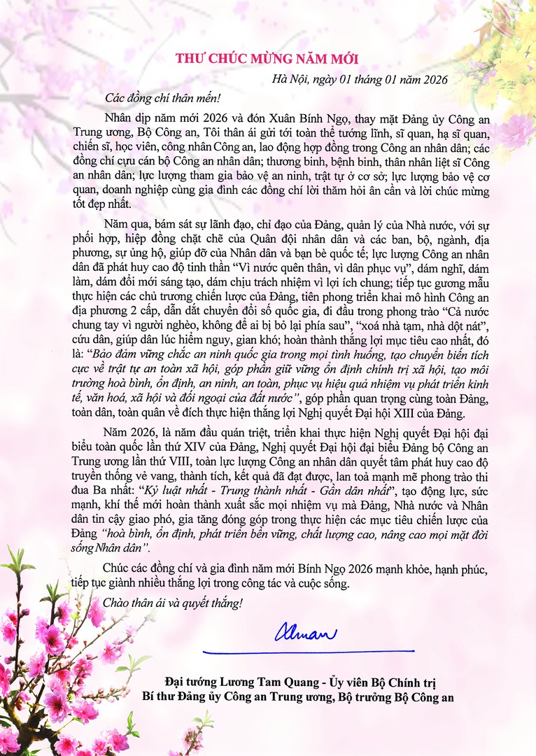 Nhân dịp năm mới 2026 và đón Xuân Bính Ngọ, Đại tướng Lương Tam Quang, Uỷ viên Bộ Chính trị, Bí thư Đảng uỷ Công an Trung ương, Bộ trưởng Bộ Công an có Thư Chúc mừng năm mới gửi tới toàn thể tướng lĩnh, sĩ quan, hạ sĩ quan, chiến sĩ, học viên, công nhân Công an, lao động hợp đồng trong Công an nhân dân; các đồng chí cựu cán bộ Công an nhân dân; thương binh, bệnh binh, thân nhân liệt sĩ Công an nhân dân; lực lượng tham gia bảo vệ an ninh, trật tự ở cơ sở; lực lượng bảo vệ cơ quan, doanh nghiệp cùng gia đình. Trang thông tin điện tử Trường Đại học CSND trân trọng giới thiệu toàn văn Thư Chúc mừng của đồng chí Bộ trưởng.