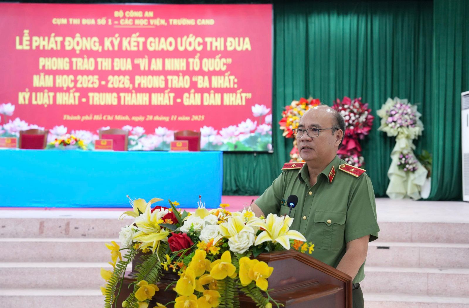 Tại buổi lễ, đồng chí PGS TS, Đại tá Nguyễn Thành Phúc - Phó Bí thư Đảng ủy, Phó Hiệu trưởng Trường Đại học CSND, đơn vị Cụm trưởng Cụm thi đua số 1 nhấn mạnh, Lễ ký hôm nay không chỉ góp phần phát huy những thành tích đã đạt được trong năm học trước, triển khai thực hiện chương trình, nhiệm vụ công tác trọng tâm tnăm học 2025 - 2026 trong các học viện, trường CAND, mà còn có ý nghĩa thiết thực trong hưởng ứng phong trào “Ba nhất: Kỷ luật nhất - Trung thành nhất - Gần dân nhất” do Bộ Công an phát động.