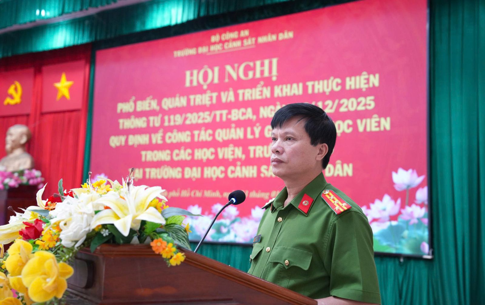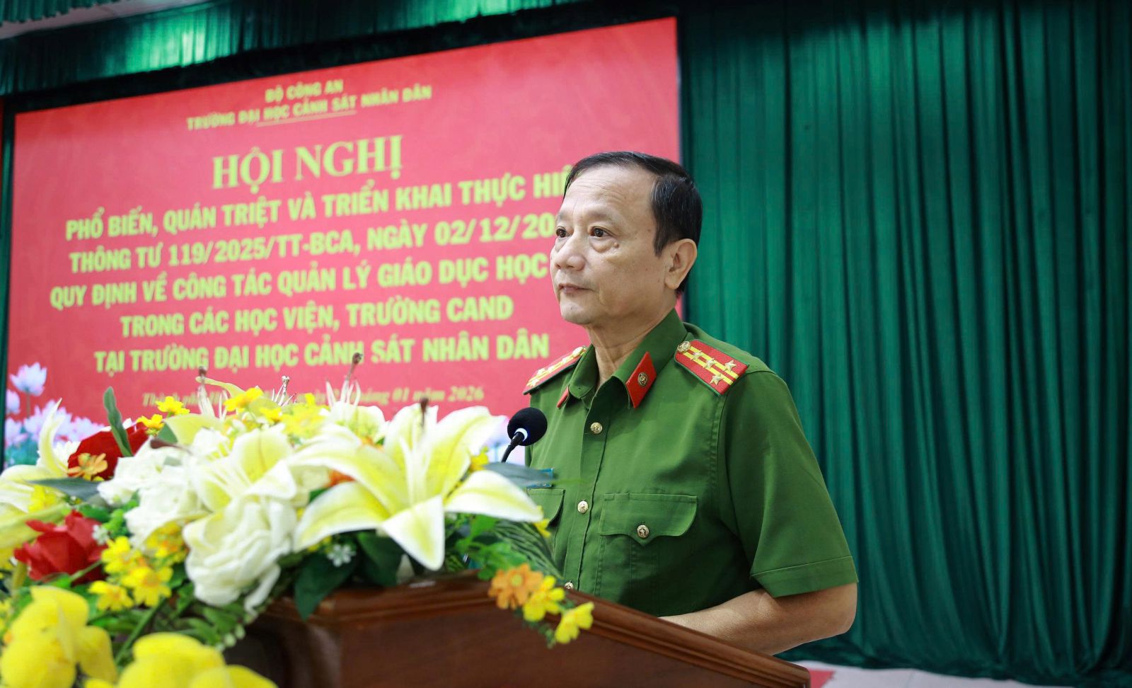 Sáng ngày 23/01/2026, Trường Đại học Cảnh sát nhân dân (CSND) đã tổ chức Hội nghị triển khai thực hiện Thông tư số 119/2025/TT-BCA về công tác quản lý giáo dục học viên trong các học viện, trường Công an nhân dân (CAND). Đồng chí PGS TS, Đại tá Nguyễn Giang Nam – Phó Hiệu trưởng Nhà trường chủ trì Hội nghị.