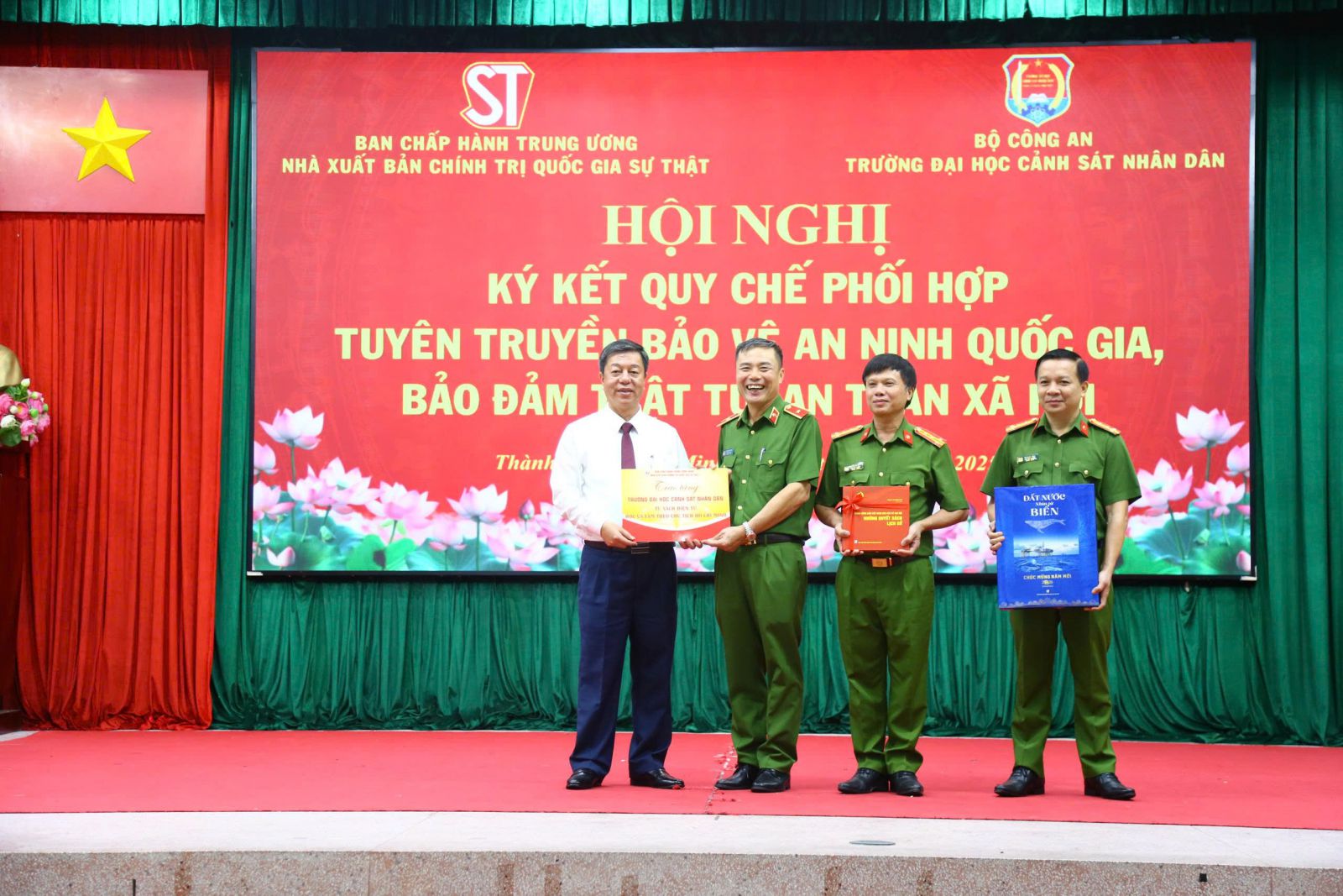 Thay mặt Đảng ủy, Ban Giám hiệu, đồng chí PGS TS, Thiếu tướng Đỗ Anh Tuấn tặng quà lưu niệm Nhà xuất bản Chính trị quốc gia Sự thật