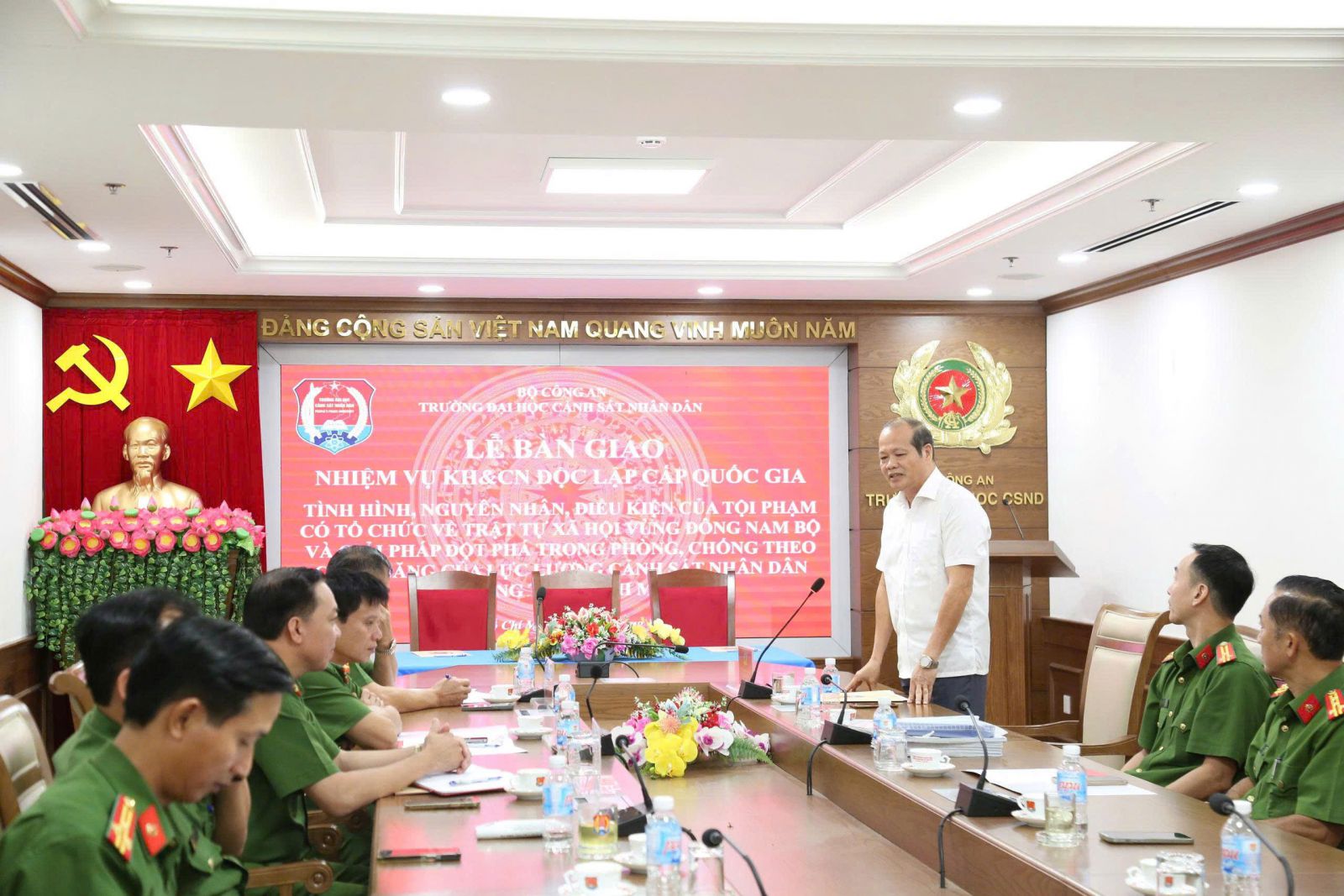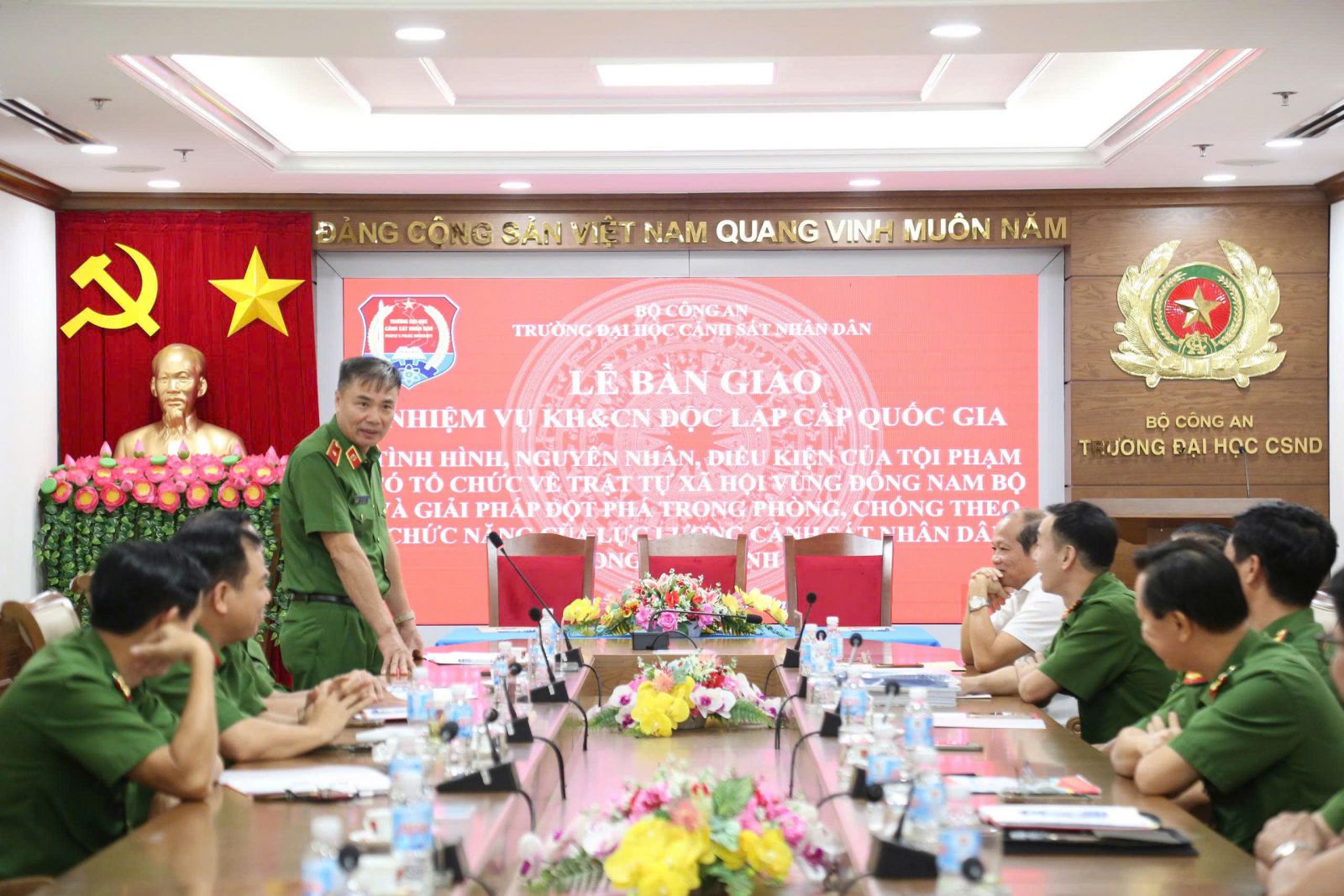 Phát biểu tiếp nhận vai trò Chủ nhiệm nhiệm vụ KH&CN, đồng chí PGS TS, Thiếu tướng Đỗ Anh Tuấn - Hiệu trưởng Trường Đại học CSND nhấn mạnh sẽ quyết tâm, quyết liệt trong công tác chỉ đạo, tiếp tục triển khai hiệu quả các phần việc còn lại, bảo đảm chất lượng khoa học và tiến độ theo yêu cầu của Bộ KH&CN.