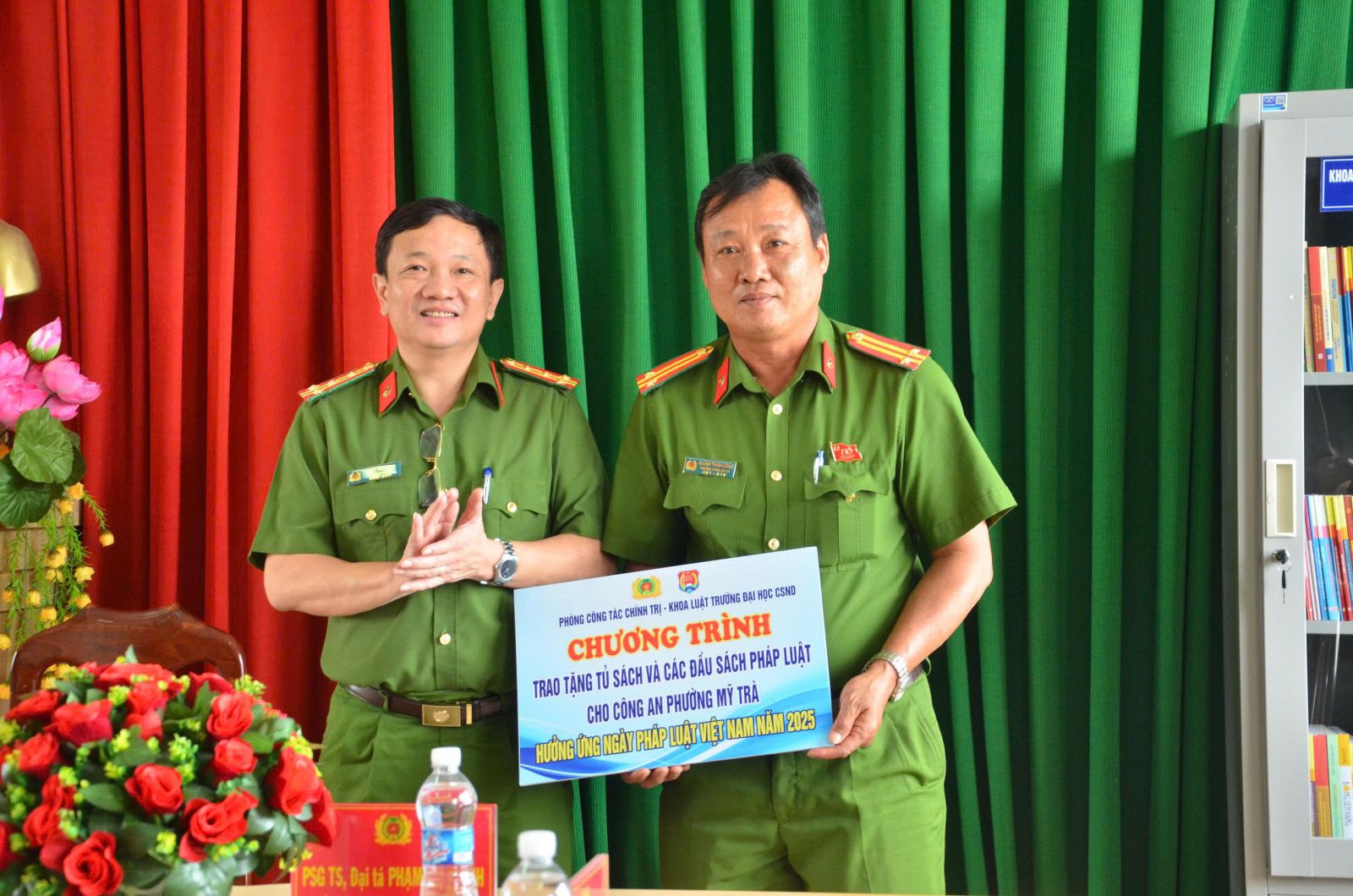 Khoa Luật - Trường Đại học CSND tặng 50 phần quà cho các em học sinh có hoàn cảnh khó khăn; trao tặng 01 tủ sách và 200 đầu sách pháp luật cho Công an phường Mỹ Trà