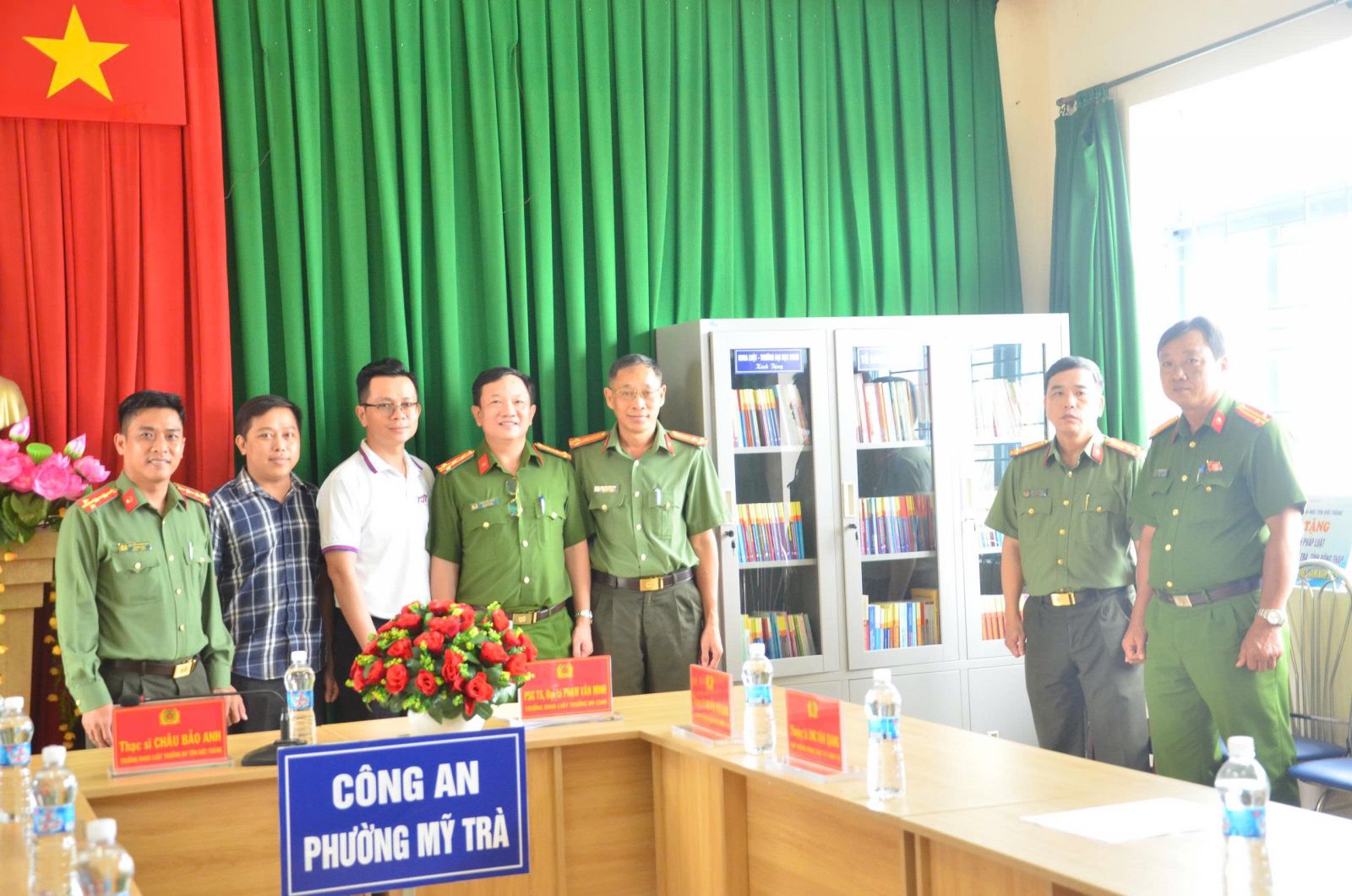 Đại diện Lãnh đạo các đơn vị chụp hình lưu niệm cùng Tủ sách pháp luật trao tặng cho Công an phường Mỹ Trà