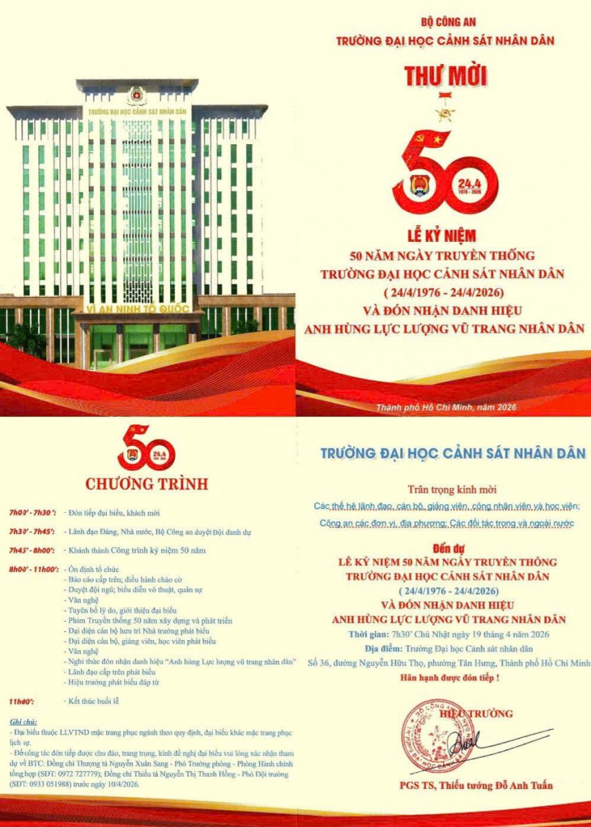 Trường Đại học Cảnh sát nhân dân trân trọng kính mời các thế hệ lãnh đạo, cán bộ, giảng viên, công nhân viên và học viên; Công an các đơn vị, địa phương; các đối tác trong và ngoài nước đến dự Lễ kỷ niệm của Nhà trường. Sự có mặt của quý đại biểu là niềm vinh dự, góp phần to lớn để buổi Lễ diễn ra thành công, trở thành điểm nhấn đặc biệt trong những trang sử vàng của mái Trường Đại học Cảnh sát nhân dân qua 50 năm xây dựng và phát triển.