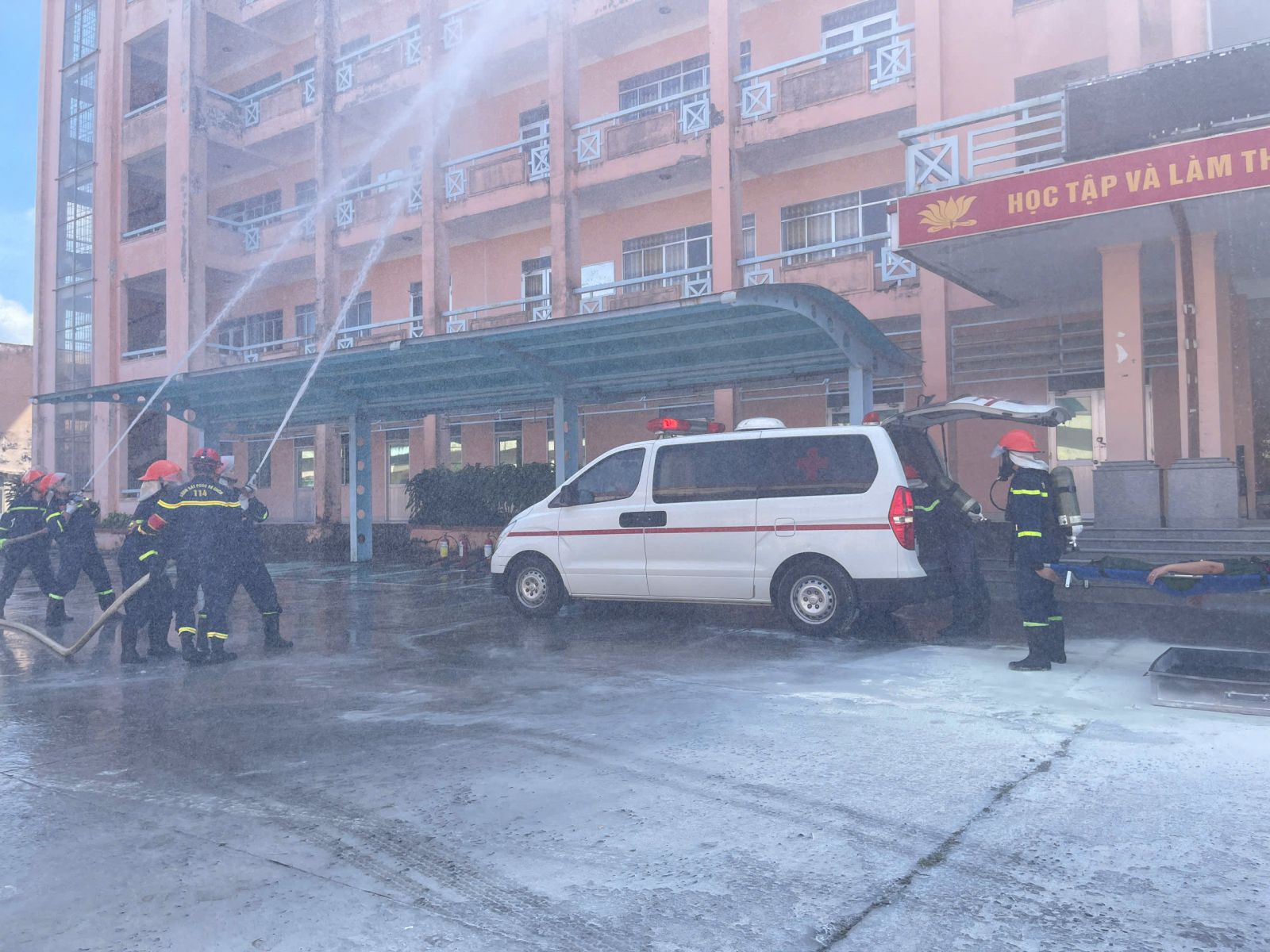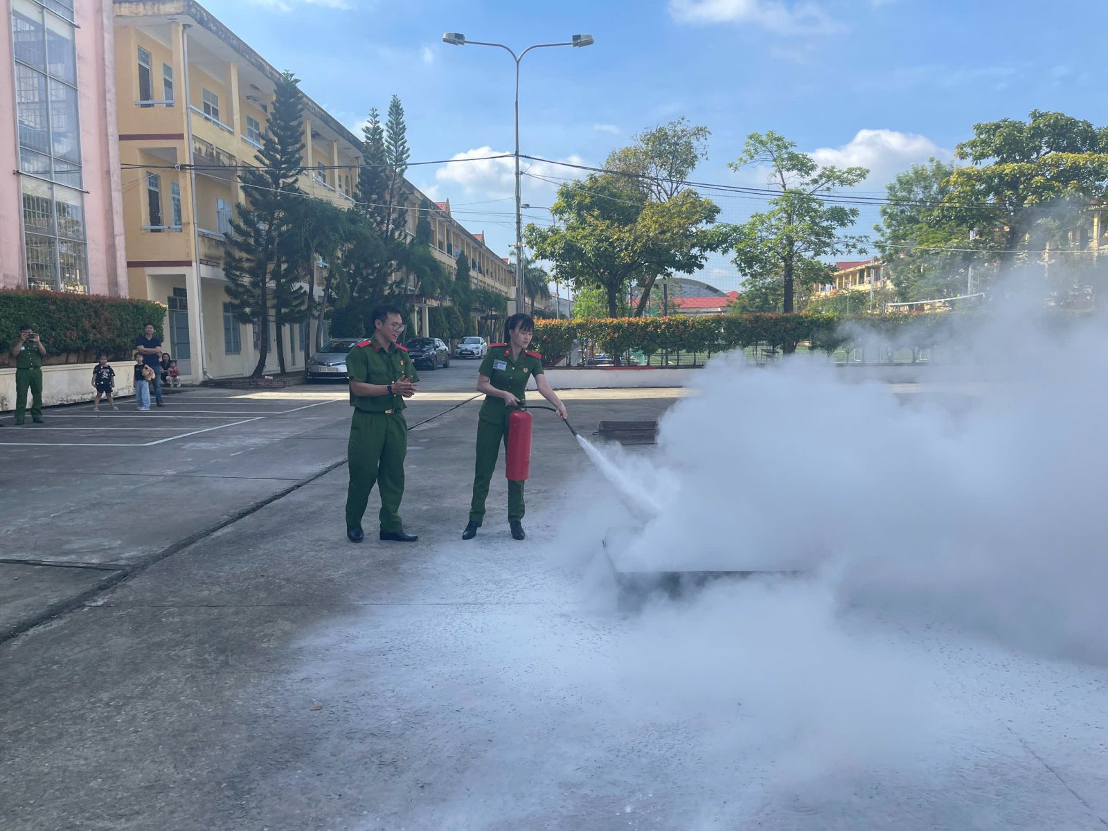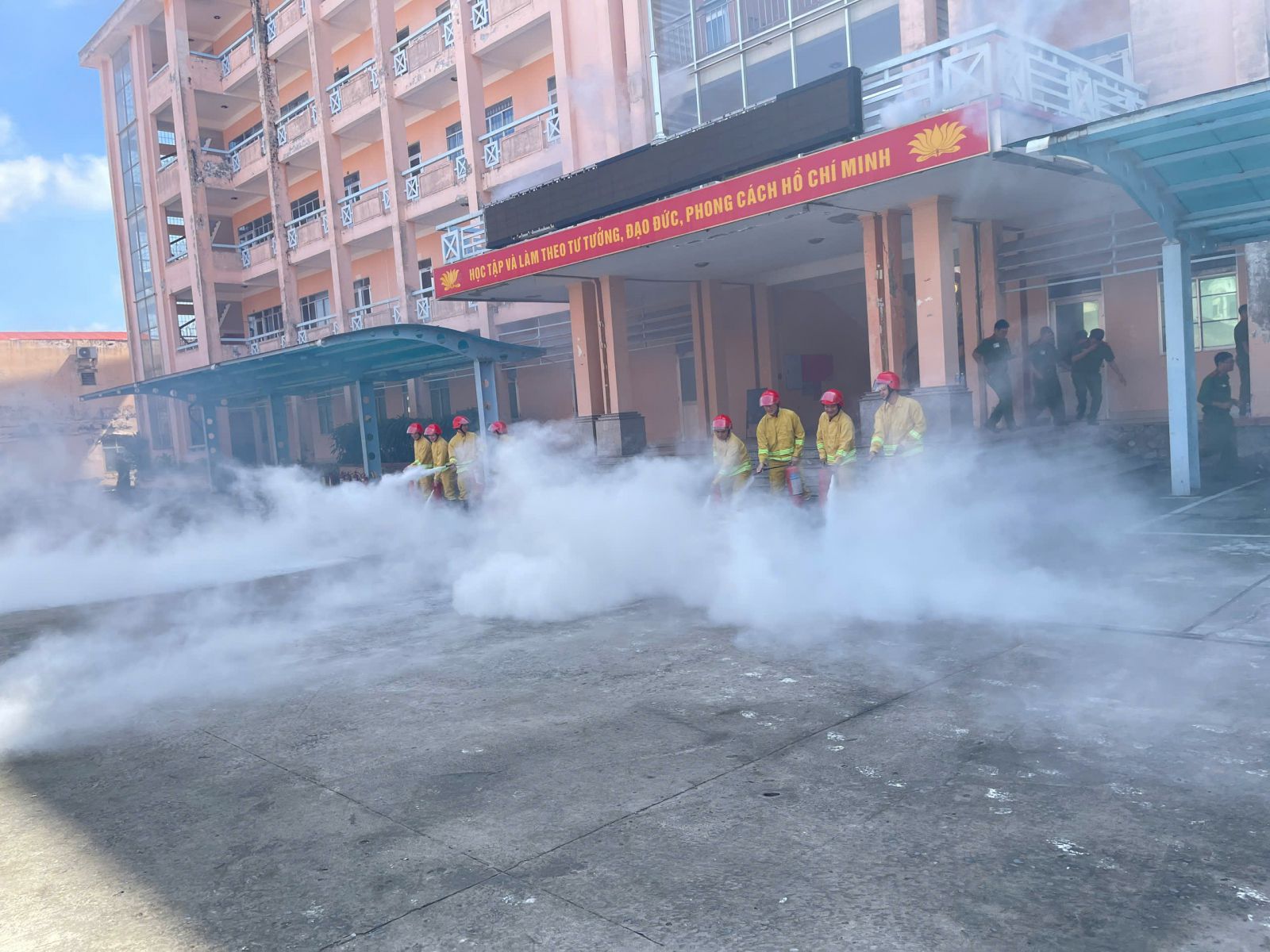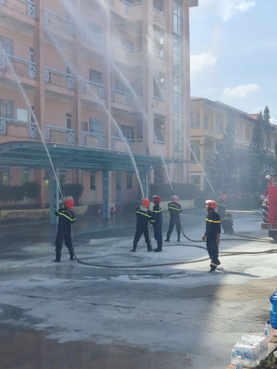 Giả định tình huống cháy xảy ra lúc 14h00 ngày 20/12/2025, tại phòng 302H, tầng 3 tòa nhà H1 (tòa nhà hội trường học tập 5 tầng); nguyên nhân cháy do sự cố chập hệ thống điện. Lửa bắt cháy vào các chất dễ cháy tạo ra nhiều khói, khí độc, rồi tiếp tục lan ra các khu vực khác. Thực hiện đúng phương án đã được xây dựng, ngay khi phát hiện đám cháy, lực lượng PCCC&CNCH cơ sở đã triển khai phương án chữa cháy, hướng dẫn, hỗ trợ người bị nạn di chuyển ra khỏi tòa nhà; sử dụng các phương tiện chữa cháy như bình chữa cháy xách tay để chữa cháy và ngăn chặn nguy cơ cháy lan, cháy lớn; tổ chức cứu nạn, cứu hộ tìm kiếm người bị thương và đưa 03 nạn nhân bị thương ra khỏi khu vực cháy; đồng thời di dời các tài sản có giá trị. Theo tình huống, lực lượng PCCC&CNCH cơ sở không ngăn được đám cháy, có nguy cơ cháy lan, diễn biến phức tạp, có 02 nạn nhân mắc kẹt gần vị trí cháy và bị thương do hít phải khí độc. Trước tình hình đó, lực lượng PCCC&CNCH cơ sở đã báo ngay cho lực lượng Cảnh sát PCCC và CNCH Công an thành phố Cần Thơ (qua số điện thoại 114).