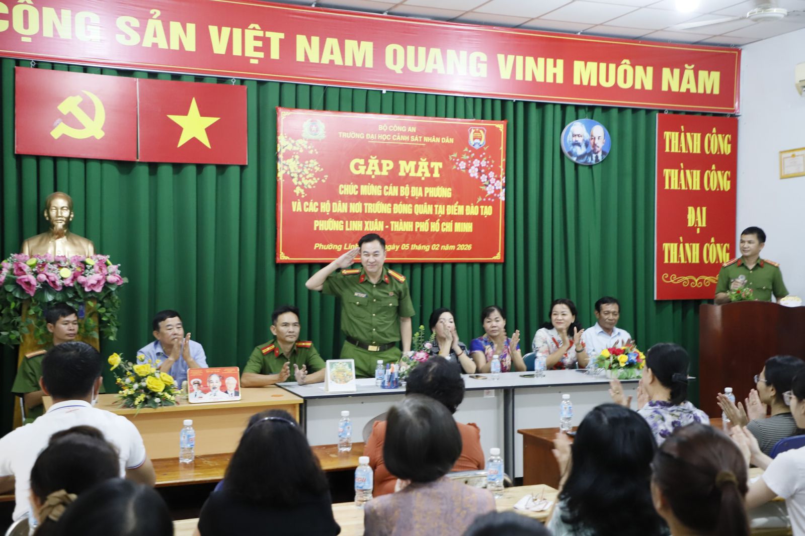 Dự các buổi gặp mặt có đại diện lãnh đạo cấp ủy Đảng, chính quyền địa phương; lực lượng Công an cơ sở; Ban điều hành khu phố và nhân dân khu vực Trường đóng quân tại hai điểm đào tạo. Hoạt động thể hiện sự quan tâm, trách nhiệm của Nhà trường trong công tác dân vận, góp phần tăng cường mối quan hệ gắn bó giữa lực lượng Công an nhân dân với cấp ủy, chính quyền và nhân dân địa phương, xây dựng thế trận an ninh nhân dân vững chắc tại địa bàn.