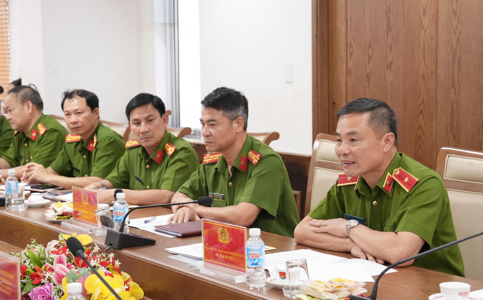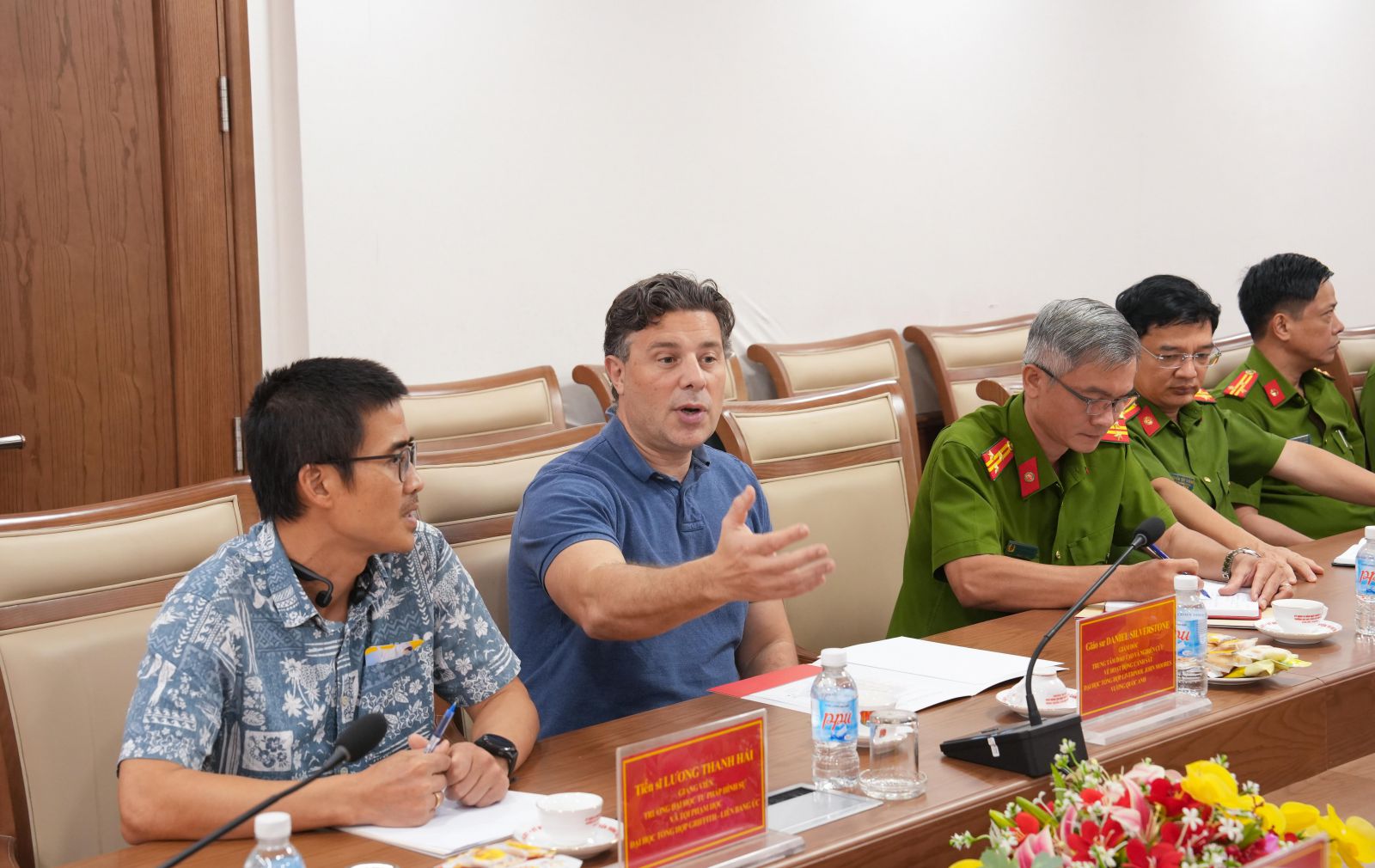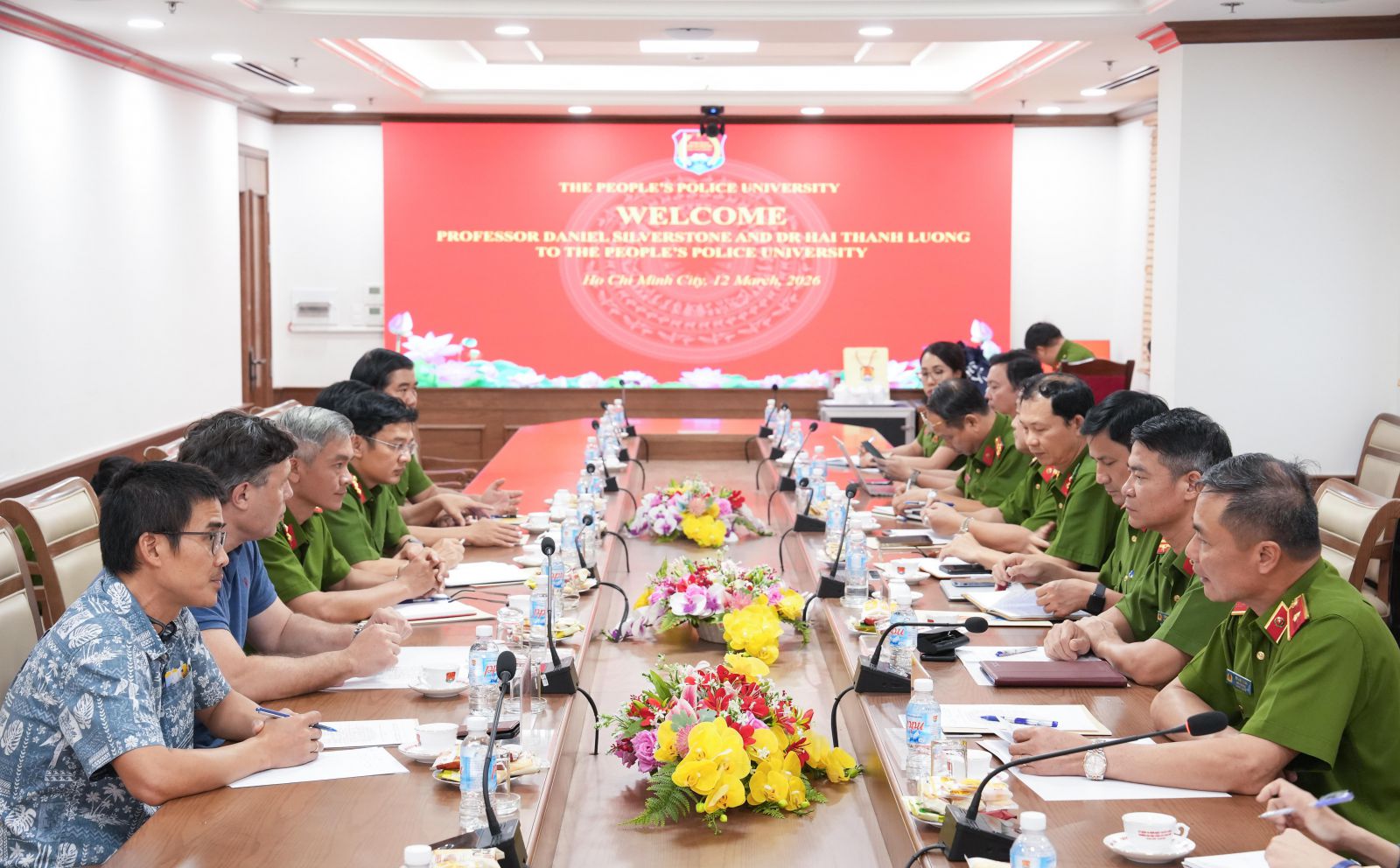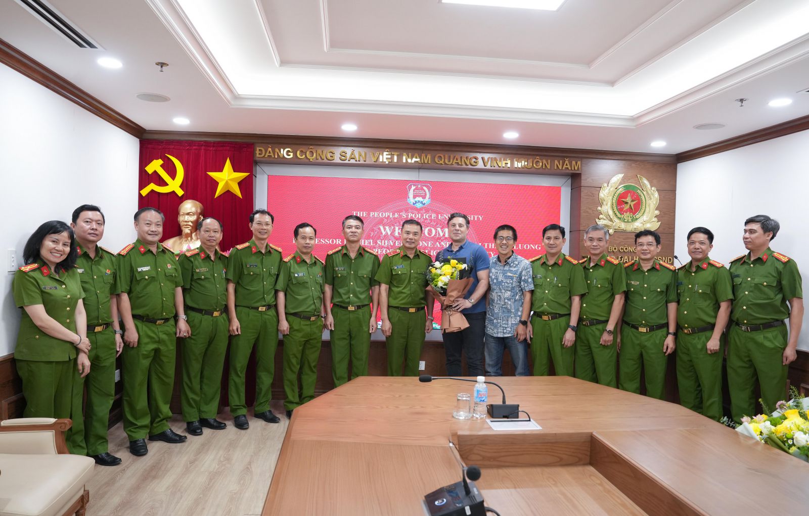 Đón tiếp Giáo sư Daniel Silverstone và Tiến sĩ Lương Thanh Hải, về phía Trường Đại học CSND có đồng chí PGS TS, Thiếu tướng Đỗ Anh Tuấn - Hiệu trưởng; đồng chí Tiến sỹ, Đại tá Trần Xuân Tân - Phó Hiệu trưởng và đại diện lãnh đạo các đơn vị chức năng thuộc Trường.