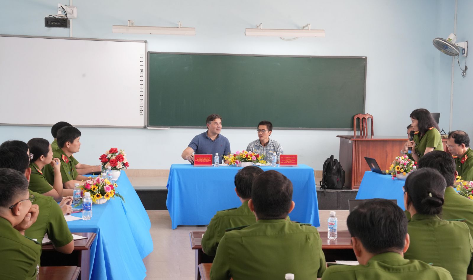 Trước đó, Giáo sư Daniel Silverstone và Tiến sĩ Lương Thanh Hải đã báo cáo hai chuyên đề: “Chia sẻ kinh nghiệm trong nghiên cứu học thuật về hoạt động của lực lượng Cảnh sát và công tác phòng, chống tội phạm xuyên quốc gia từ góc độ nghiên cứu của Vương quốc Anh và Liên bang Úc”; “Chia sẻ kinh nghiệm về áp dụng AI (trí tuệ nhân tạo) trong công tác phòng, chống tội phạm và nghiên cứu công bố quốc tế” cho gần 100 cán bộ, giảng viên, học viên khóa Nghiên cứu sinh 14 của Nhà trường. Buổi báo cáo diễn ra sôi nổi, góp phần cập nhật kiến thức, mở rộng góc nhìn quốc tế, nâng cao năng lực nghiên cứu, giảng dạy, học tập đáp ứng yêu cầu công tác giáo dục - đào tạo trong thời kỳ hội nhập và phát triển.