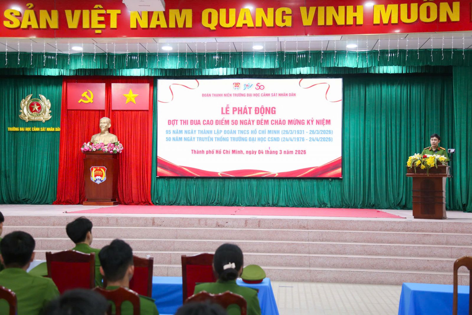 Đó là chủ đề đợt thi đua cao điểm “50 ngày đêm” chào mừng kỷ niệm 95 năm ngày thành lập đoàn TNCS Hồ Chí Minh (26/3/1931 - 26/3/2026) và 50 năm ngày truyền thống Nhà trường (24/4/1976 - 24/4/2026) do Đoàn TNCS Hồ Chí Minh Trường Đại học CSND phát động.