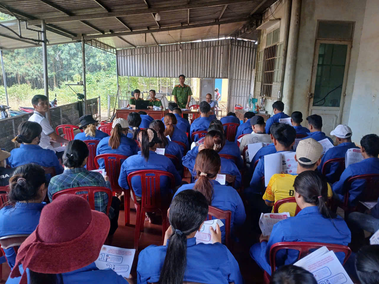 Đại úy Thân Văn Đào cùng công an xã tuyên truyền pháp luật cho bà con