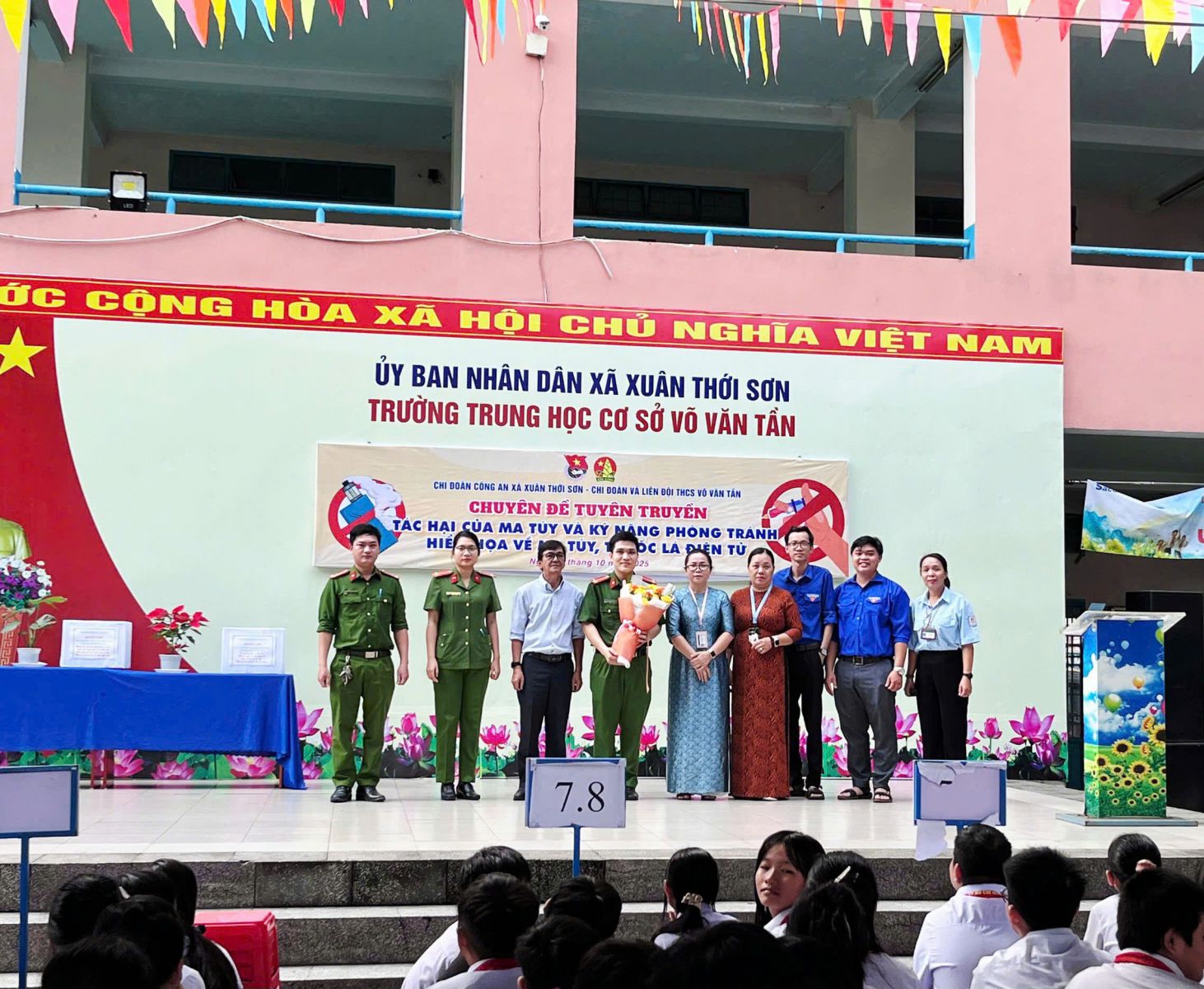 Ban Giám hiệu Trường THCS Võ Văn Tần và đại diện Công an xã Xuân Thới Sơn, TP. Hồ Chí Minh trao hoa cảm ơn báo cáo viên
